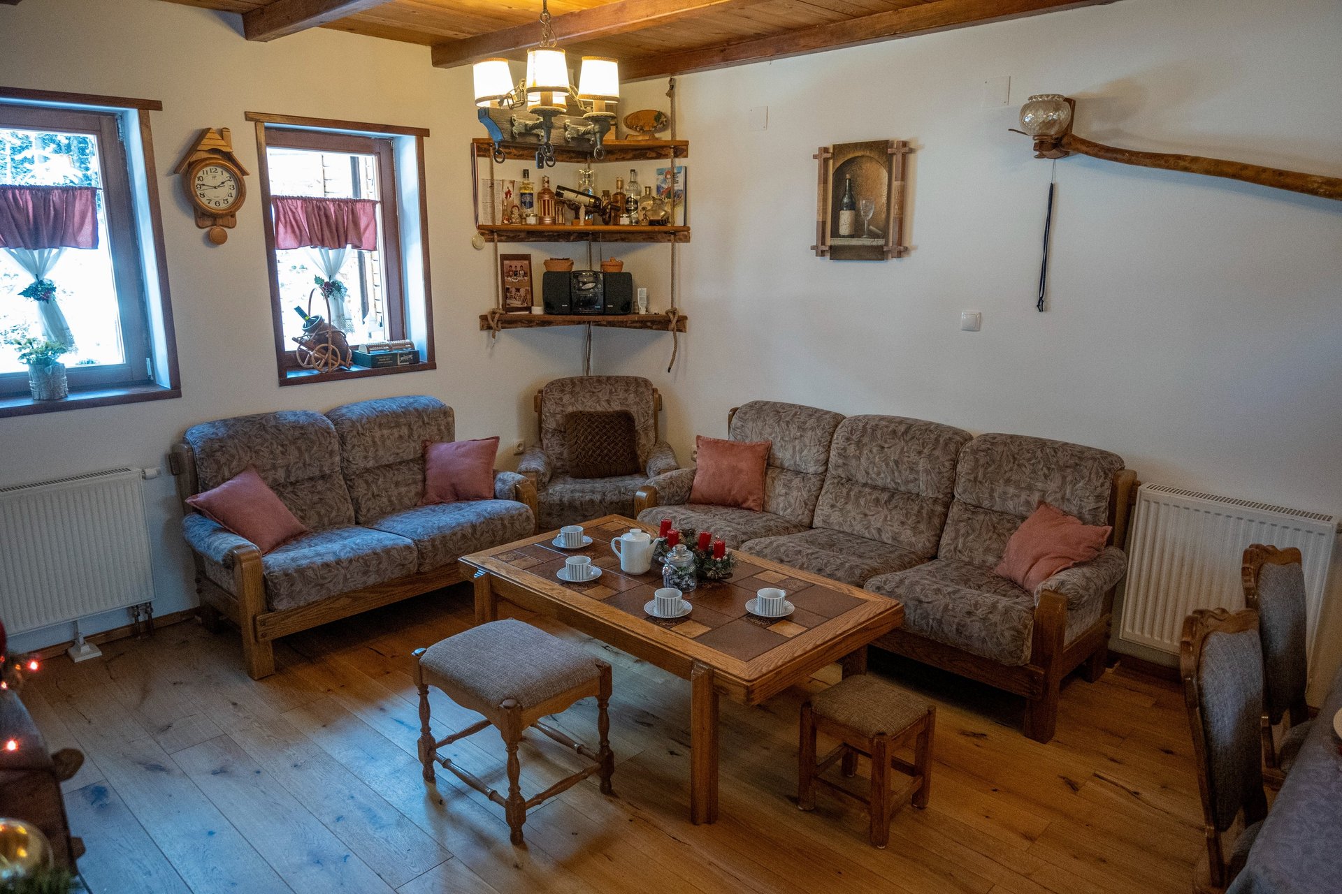 Dnevni boravak Vikendice Klara nudi savršen spoj udobnosti i planinskog šarma. Uživajte u toplini kamina, udobnoj garnituri i pogledu na prirodu Blidinja kroz velike prozore. Idealno mjesto za opuštanje i zajedničke trenutke nakon dana provedenog u planini.